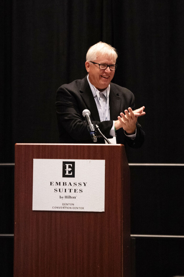 Randy Loftis, senior lecturer at University of North Texas, introduces keynote speaker Olive Talley at the Hall of Fame Banquet. Talley is an award-winning producer, journalist and manager of creative teams.