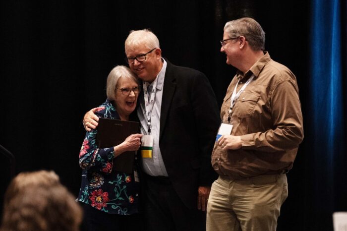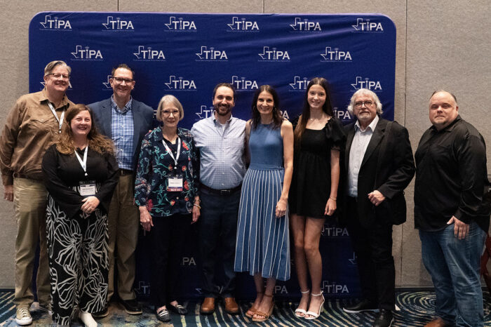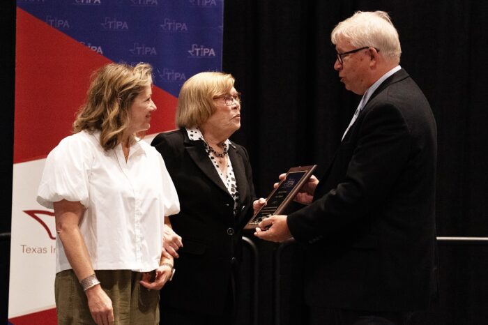 Bettye Craddock receives the Hall of Fame award from former student Dave Wilson and Doug Pils, chair of the TIPA Hall of Fame committee.