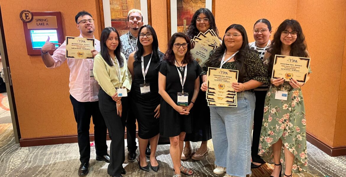 Teresa Talerico, center, poses for a photo with The Mesquite team during the Texas Intercollegiate Press Association conference on April 13, 2024. Photo Courtesy of Trey Lopez